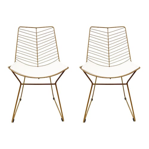 - Nossa cadeira é produzida toda em aço maciço e em sua composição contém os ferros: 7/16", 5/16" e arame de 4mm. É revestida com pintura eletrostática epóxi na cor dourado fosco e possui assento composto de uma camada de e.v.a revestido em material sintético na cor branco.