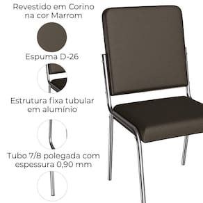 Conjunto 2 cadeiras 2C091, ideais para salas de jantar ou recepções. Estrutura em MDP (15 mm), base/ pés tubular em alumínio (tubo 7/8 polegada com espessura 0,90 mm). Estofadas com espuma D26 e revestido em Corino (material sintético que imita couro) garantindo conforto, durabilidade e fácil limpeza. Possui sapatas para proteção ao piso. Este produto será entregue em 01 volume.