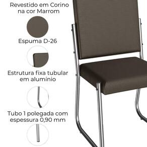 Conjunto 2 cadeiras 2C139, ideais para salas de jantar ou recepções. Estrutura em MDP (15 mm), base/ pés tubular em alumínio (tubo 1 polegada com espessura 0,90 mm). Estofadas com espuma D26 e revestido em Corino (material sintético que imita couro) garantindo conforto, durabilidade e fácil limpeza. Possui sapatas para proteção ao piso. Este produto será entregue em 01 volume.