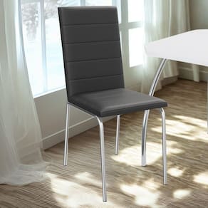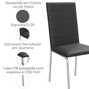 Conjunto 2 cadeiras 2C091, ideais para salas de jantar ou recepções. Estrutura em MDP (15 mm), base/ pés tubular em alumínio (tubo 7/8 polegada com espessura 0,90 mm). Estofadas com espuma D20 e revestido em Corino (material sintético que imita couro) garantindo conforto, durabilidade e fácil limpeza. Possui sapatas para proteção ao piso. Este produto será entregue em 01 volume.