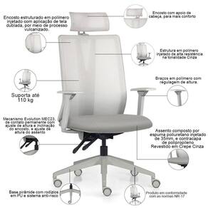 Color: CinzaCinza | ColorFamily: Cinza | ColorSimple: Cinza | ColorSupplier: CinzaCinza | Com apoio de braços: Sim | Com aro para pés: Não | Com rodas: Sim | Cor: CinzaCinza | Formato de venda: Kit 2 unidades | Materiais do aro para pés: na | Material: Polímero injetado, espuma injetada, tela dublada vulcanizada, rodízios em PU, revestimento em Crepe | Material do estofamento: Espuma Injetada | MaterialFamily: Polímero | Model: Flow Diretor | Modelo: Flow Diretor | Modelo detalhado: Flow Diretor | OriginCountry: Brasil | OriginState: PR | ProductContents: 02 Cadeiras de Escritório | ProductHeight: 81 cm | ProductInstructions: Produto para uso em ambiente interno, nao devendo ficar exposto ao sol, calor e umidade excessivos. | ProductLength: 71 cm | ProductWarranty: 90 dias após o recebimento do produto | ProductWeight: 13 kg | ProductWidth: 71 cm | Requer montagem: Sim | SizeDescription: Altura: 81 cm x Largura: 71 cm x Profundidade: 71 cm | SupplierSimpleName: Kit 2 Cadeiras de Escritório Giratória Diretor Flow F02 Base Cinza Crepe Cinza - Lyam Decor | Tipo de cadeira de escritório: Diretor Giratória