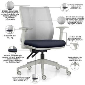 Color: CinzaAzul | ColorFamily: Cinza | ColorSimple: Cinza | ColorSupplier: CinzaAzul | Com apoio de braços: Sim | Com aro para pés: Não | Com rodas: Sim | Cor: CinzaAzul | Formato de venda: Kit 2 unidades | Materiais do aro para pés: na | Material: Polímero injetado, espuma injetada, tela dublada vulcanizada, rodízios em PU, revestimento em Sintét | Material do estofamento: Espuma Injetada | MaterialFamily: Polímero | Model: Flow Diretor | Modelo: Flow Diretor | Modelo detalhado: Flow Diretor | OriginCountry: Brasil | OriginState: PR | ProductContents: 02 Cadeiras de Escritório | ProductHeight: 81 cm | ProductInstructions: Produto para uso em ambiente interno, nao devendo ficar exposto ao sol, calor e umidade excessivos. | ProductLength: 71 cm | ProductWarranty: 90 dias após o recebimento do produto | ProductWeight: 13 kg | ProductWidth: 71 cm | Requer montagem: Sim | SizeDescription: Altura: 81 cm x Largura: 71 cm x Profundidade: 71 cm | SupplierSimpleName: Kit 2 Cadeiras de Escritório Giratória Diretor Flow F02 Base Cinza Sintético Azul - Lyam Decor | Tipo de cadeira de escritório: Diretor Giratória