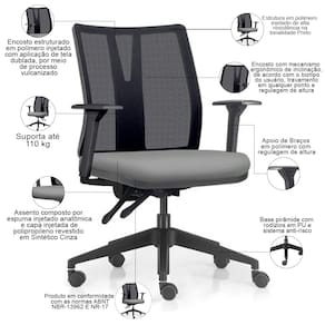 Peso máximo suportado 110 kg, com uso recomendado de 8 horas diária.