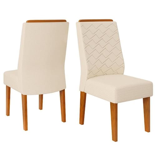 Design funcional com inclinação no encosto e acabamento bordado, ideal para compor ambientes com conforto e elegância. Kit 02 Cadeiras de jantar com estrutura em MDP/MDF de 18 e 25 mm (suporta até 130 kg). Assento e encosto estofados com espuma D20 e D13, revestidos em tecido 100% poliéster. Encosto com detalhe bordado, inclinação ergonômica e espaldar em MDF. Possui quatro pés em MDF de 25 mm com sapatas deslizadoras. Acabamento em impressão UV texturizada fosca e bordas em papel. Este móvel chegará em sua casa separado em 01 volume.