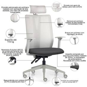 Color: CinzaGrafite | ColorFamily: Cinza | ColorSimple: Cinza | ColorSupplier: CinzaGrafite | Com apoio de braços: Sim | Com aro para pés: Não | Com rodas: Sim | Cor: CinzaGrafite | Formato de venda: Kit 2 unidades | Materiais do aro para pés: na | Material: Polímero injetado, espuma injetada, tela dublada vulcanizada, rodízios em PU, revestimento em Linho | Material do estofamento: Espuma Injetada em Poliuretano 35mm | MaterialFamily: Polímero | Model: Flow Presidente | Modelo: Flow Presidente | Modelo detalhado: Flow Presidente | OriginCountry: Brasil | OriginState: PR | ProductContents: 02 Cadeiras de Escritório | ProductHeight: 111 cm | ProductInstructions: Produto para uso em ambiente interno, nao devendo ficar exposto ao sol, calor e umidade excessivos. | ProductLength: 71 cm | ProductWarranty: 90 dias após o recebimento do produto | ProductWeight: 13 kg | ProductWidth: 71 cm | Requer montagem: Sim | SizeDescription: Altura: 111 cm x Largura: 71 cm x Profundidade: 71 cm | SupplierSimpleName: Kit 2 Cadeiras Escritório Giratória Presidente Flow F02 Base Cinza Linho Grafite - Lyam Decor | Tipo de cadeira de escritório: Presidente Giratória