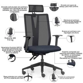 Color: PretoAzul | ColorFamily: Preto | ColorSimple: Preto | ColorSupplier: PretoAzul | Com apoio de braços: Sim | Com aro para pés: Não | Com rodas: Sim | Cor: PretoAzul | Formato de venda: Kit 2 unidades | Materiais do aro para pés: na | Material: Polímero injetado, espuma injetada, tela dublada vulcanizada, rodízios em PU, revestimento em Sintét | Material do estofamento: Espuma Injetada em Poliuretano 35mm | MaterialFamily: Polímero | Model: Flow Presidente | Modelo: Flow Presidente | Modelo detalhado: Flow Presidente | OriginCountry: Brasil | OriginState: PR | ProductContents: 02 Cadeiras de Escritório | ProductHeight: 111 cm | ProductInstructions: Produto para uso em ambiente interno, nao devendo ficar exposto ao sol, calor e umidade excessivos. | ProductLength: 71 cm | ProductWarranty: 90 dias após o recebimento do produto | ProductWeight: 13 kg | ProductWidth: 71 cm | Requer montagem: Sim | SizeDescription: Altura: 111 cm x Largura: 71 cm x Profundidade: 71 cm | SupplierSimpleName: Kit 2 Cadeiras Escritório Giratória Presidente Flow F02 Base Preta Sintético Azul - Lyam Decor | Tipo de cadeira de escritório: Presidente Giratória