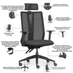 Equipada com um mecanismo Evolution, um sistema de contato permanente, essa cadeira giratória abraça as suas necessidades, permitindo ajustes precisos na altura do assento, do encosto e dos braços. Cada detalhe foi pensado para proporcionar um suporte ideal, respeitando o biotipo do usuário e promovendo uma postura saudável durante longas horas de trabalho. Já a base pirâmide, adornada com rodízios em PU e sistema anti-risco, desliza suavemente sobre qualquer superfície, garantindo movimentos ágeis e seguros. Por fim, o encosto com apoio de cabeça completa a experiência, permitindo que você se concentre no que realmente importa, enquanto sua mente flui livremente.