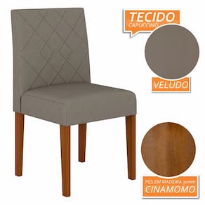 Kit 02 Cadeiras Hungria com estética contemporânea e receptiva, perfeita para todos os tipos de ambientes.Detalhes Técnicos das Cadeiras- Assento e Encosto Tapeçados, Estofados e Fixos- Cadeira suporta até 90KG- Facilidade da Montagem: Difícil- Tonalidade Cadeira: Cinamomo/Veludo Capuccino- Espuma do Assento: D16- Espuma do Encosto: D14- Material: Estrutura em MDF/ Pés em Madeira- Medida da Cadeira: A: 94CM x L: 50CM x P: 50CMConteúdo da Embalagem- 02 Cadeiras- Manual de Montagem- Acessórios para MontagemObservações Importantes- As imagens ambientadas são meramente ilustrativas e podem apresentar itens que não incorporam o produto;- Todos os nossos produtos são novos, acompanham documento fiscal e possuem garantia de 3 meses, essa garantia cobre somente defeitos de fabricação;- A entrega só será efetuada no endereço do CEP, caso o endereço seja diferente do CEP informado no pedido, a entrega terá cobrança adicional e o comprador arcará com as despesas;- Não realizamos entregas para zonas rurais, via caminhos fluviais e distritos, por isso não aceitamos CEP GERAL da região;- Não é possível realizar o agendamento de entrega do produto, é necessário que acompanhe o rastreio de seu pedido para saber a previsão de entrega;- As entregas somente serão realizadas para um responsável maior de idade (+18);- Enviamos para diversos estados, sendo assim nossas entregas são realizadas por transportadoras parceiras de nossa empresa. Confira as dimensões antes da compra e certifique-se de que o produto passará por elevadores, portas e corredores já que nossa entrega não inclui a subida de lances de escada, transporte por elevador e o lançamento de produtos, em caso de condomínios residenciais a entrega é feita somente até a portaria. Todas as entregas são realizadas em dias e horários comerciais;- Ao receber os seus produtos observe se a embalagem se encontra em perfeitas condições. Se você adquiriu algum móvel, confira atentamente a quantidade de volumes e o aspecto físico das embalagens. Confira também se a cor do móvel está de acordo com o seu pedido;- O prazo de cancelamento por arrependimento é de até 7 dias corridos a contar da data de recebimento;- Os produtos e assistências são enviados DESMONTADOS, MONTAGENS E DESMONTAGENS recomendamos sempre a contratação de um montador profissional e é válido lembrar que o custo desses serviços é por conta do comprador;- Objetos decorativos que aparecem na foto não acompanham o produto;- Evitar a exposição direta à luz solar e à umidade;- Para limpeza, limpar com pano macio e seco, não utilizar qualquer outro tipo de produtos químicos;- As cores do produto podem variar de acordo com o monitor, a iluminação do ambiente ou sua percepção visual