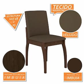 Kit 2 Cadeiras Sucre Possuem um ótimo tamanho e contam com encosto e assento estofados, um material de extrema qualidade e durabilidade e garante um toque agradável e macio.Detalhes Técnicos das Cadeiras:- Acabamento da Cadeira: Pintura com Assento e Encosto Tapeçados- Almofada do Assento: Fixa- Cadeira Estofada: Sim- Peso Suportado da Cadeira: 90 KG- Facilidade da Montagem: Média - Deve ser montada por um Profissional- Tonalidade da estrutura da Cadeira: Imbuia- Tonalidade do Tecido: Veludo Marrom- Espuma do Assento: D 23- Espuma do Encosto: D 16- Tipo de Pintura: UV Texturizada- Material da Estrutura: MDF 25mm e 18mm- Medida da Cadeira: 87CM x 46CM x 63CMConteúdo da Embalagem:- 02 Cadeiras- Manual de Montagem- Acessório para MontagemObservações Importantes- As imagens ambientadas são meramente ilustrativas e podem apresentar itens que não incorporam o produto;- Todos os nossos produtos são novos, acompanham documento fiscal e possuem garantia de 3 meses, essa garantia cobre somente defeitos de fabricação;- A entrega só será efetuada no endereço do CEP, caso o endereço seja diferente do CEP informado no pedido, a entrega terá cobrança adicional e o comprador arcará com as despesas;- Não realizamos entregas para zonas rurais, via caminhos fluviais e distritos, por isso não aceitamos CEP GERAL da região;- Não é possível realizar o agendamento de entrega do produto, é necessário que acompanhe o rastreio de seu pedido para saber a previsão de entrega;- As entregas somente serão realizadas para um responsável maior de idade (+18);- Enviamos para diversos estados, sendo assim nossas entregas são realizadas por transportadoras parceiras de nossa empresa. Confira as dimensões antes da compra e certifique-se de que o produto passará por elevadores, portas e corredores já que nossa entrega não inclui a subida de lances de escada, transporte por elevador e o lançamento de produtos, em caso de condomínios residenciais a entrega é feita somente até a portaria. Todas as entregas são realizadas em dias e horários comerciais;- Ao receber os seus produtos observe se a embalagem se encontra em perfeitas condições. Se você adquiriu algum móvel, confira atentamente a quantidade de volumes e o aspecto físico das embalagens. Confira também se a cor do móvel está de acordo com o seu pedido;- O prazo de cancelamento por arrependimento é de até 7 dias corridos a contar da data de recebimento;- Os produtos e assistências são enviados DESMONTADOS, MONTAGENS E DESMONTAGENS recomendamos sempre a contratação de um montador profissional e é válido lembrar que o custo desses serviços é por conta do comprador;- Objetos decorativos que aparecem na foto não acompanham o produto;- Evitar a exposição direta à luz solar e à umidade;- Para limpeza, limpar com pano macio e seco, não utilizar qualquer outro tipo de produtos químicos;- As cores do produto podem variar de acordo com o monitor, a iluminação do ambiente ou sua percepção visual.