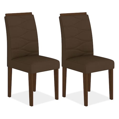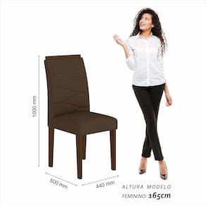 Detalhes Técnicos das Cadeiras -Assento e Encosto Tapeçados, Estofados e Fixos -Cadeira suporta até 90KG -Facilidade da Montagem:Média -Tonalidade Cadeira:Imbuia/Suede Marrom -Espuma Assento:D23 -Espuma Encosto:D16 -Pintura UV Texturizada -Material Estrutura:MDF 25mm/18mm -Medida da Cadeira:100CMx44CMx50CM
