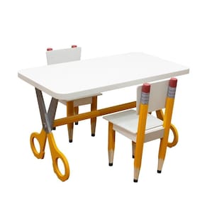 Kit 2 Cadeiras Mesa Infantil Tesoura Amarelo Tampo Branco Retangular Base Temática Para Estudos E Desenhos Mobília Decor Conjunto Mesinha Pé Tesoura + 2 Cadeiras Pé Lápis Borracha Conjunto infantil robusto com mesa de base em ?tesoura? e duas cadeiras com pés em formato de lápis (amarelo), ideal para atividades, desenhos e leitura em quartos, brinquedotecas e escolinhas, unindo estabilidade, conforto e cores vibrantes.? Mesa: 53 cm de altura; 90 x 50 cm; 18 kg; suporta até 10 kg; tampo em MDF/madeira com pintura tinta e interno Branco TX; pés em MDF no formato tesoura, fixação por parafusos; acompanha acessórios e necessita montagem.?
