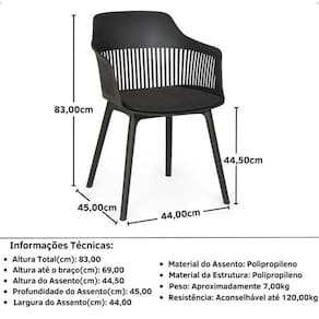 Material do encosto PolipropilenoProfundidade do assento 45 cmDistância entre os pés 52 cmPeso suportado 130 kg