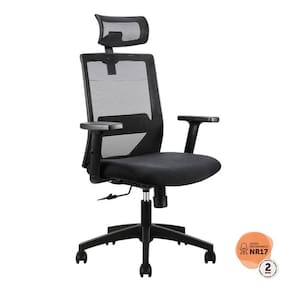 Cadeira office giratória com regulagem de altura (mínimo 112cm e máximo 122cm) e sistema relax. Assento em tela mesh com apoio de cabeça ajustável e braços ajustáveis, base e rodízios em nylon.