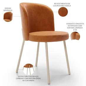 Altura da cadeira: 80 cm | Altura do assento a partir do solo: 46 cm | Color: Laranja | ColorFamily: Laranja | ColorSimple: Canela | ColorSupplier: Canela | Cor: Canela | Cor da estrutura da cadeira: Arena | Cor do assento: Canela | Cor do estofamento: Canela | Desenho do tecido: Liso | É cadeira de balanço: Não | É dobrável: Não | É empilhável: Não | Espessura do assento: na | Fabricante: Lyam Decor | Firmeza: Firmeza | Largura da cadeira: 44 cm | Largura do assento: 42 cm | Material: Estrutura em Aço carbono, Revestimento em Couríssimo e espuma | Material do estofamento: Couríssimo e espuma | MaterialFamily: Aço carbono, couro sintético e espuma | Model: Gavi | OriginCountry: Nacional | OriginState: PR | Peso máximo suportado: 120 kg | ProductContents: 02 Cadeiras | ProductHeight: 81 cm | ProductInstructions: Produto para uso em ambiente interno, nao devendo ficar exposto ao sol, calor e umidade excessivos. | ProductLength: 53 cm | ProductWarranty: 90 dias após o recebimento do produto | ProductWeight: 10 kg | ProductWidth: 44 cm | Profundidade da cadeira: 53 cm | Profundidade do assento: 42 cm | Requer montagem: Não | SizeDescription: Altura: 81 cm x Largura: 44 cm x Profundidade: 53 cm | SupplierSimpleName: Kit 2 Cadeiras Sala de Jantar Estofada Gavi Arena L02 Couríssimo Canela - Lyam Decor | Tempo de montagem: na