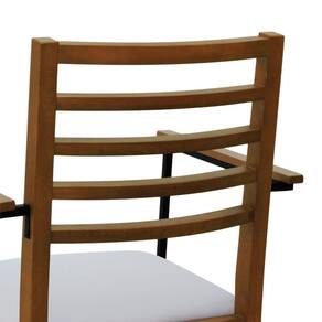 - Materiais: Estrutura em madeira de eucalipto maciço, assento estofado e encosto ripado, braços em aço de carbono com pintura epóxi e madeira tingida na cor amêndoa.