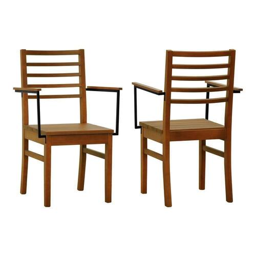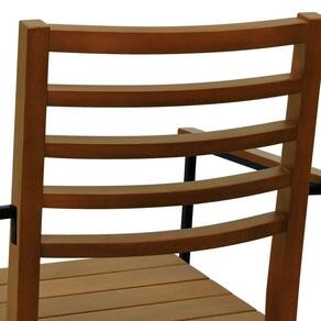 - Materiais: Estrutura em madeira de eucalipto maciço, assento estofado e encosto ripado, braços em aço de carbono com pintura epóxi e madeira tingida na cor amêndoa.