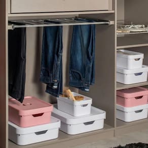 Com alças ergonômicas, a caixa proporciona um manuseio e transporte confortáveis, além de permitir a ventilação adequada dos objetos armazenados. As caixas Cube possuem um design inteligente que permite encaixar e empilhar unidades de diferentes tamanhos de forma segura e estável, otimizando seu espaço e organização.