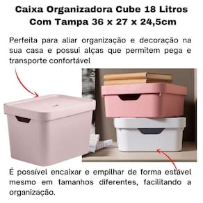 Aprimore sua casa com a elegante e versátil Caixa Organizadora Cube de 18 Litros com Tampa, medindo 36 x 27 x 24,5 cm. Projetada para combinar funcionalidade e estilo, esta caixa oferece uma ampla gama de cores que harmonizam com qualquer ambiente da sua casa. A linha Cube foi criada pensando no seu bem-estar diário, facilitando a organização e o transporte dos seus itens.