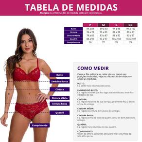 Busto 89 a 93cm / Cintura 79 a 83cm / Cintura Média 83 a 87cm / Quadril 93 a 97cm / Comprimento 77cm