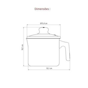 Especificações tecnicas: - Peso Líquido: 0,5800 kg. - Peso Bruto: 0,5800 kg. - Metragem: 0,005822 m³. - Dimensões Embalagem (Compr. X Larg. X Alt.): 199x 159x 184 mm. - Dimensões Produto (Compr. X Larg. X Alt.): 191x 154x 181 mm. - Diâmetro: 14,0 cm. - Capacidade: 1,90 l.