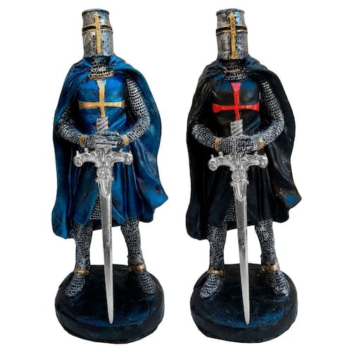 Kit com 2 Cavaleiros Templários Guerreiros Medievais em resina e Espadas em metal, para decoração. Nas cores Azul e Preto. CARACTERÍSTICAS Altura: 23 cm Comprimento: 9 cm Largura: 8,5 cm Peso: 700 g Conteúdo da embalagem: 2 Guerreiros Templarios Medievais Azul e Preto Produto: Em resina de alta qualidade. Por ser um produto semi artesanal, pode haver variação nos tons das cores. Marca: Mahalo Artesanato