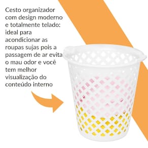 Cesto organizador com design moderno e totalmente telado: ideal para acondicionar as roupas sujas pois a passagem de ar evita o mau odor e você tem melhor visualização do conteúdo interno. E a praticidade não fica só nisso: possui também pegas laterais que ajudam no vai e vem do dia a dia.