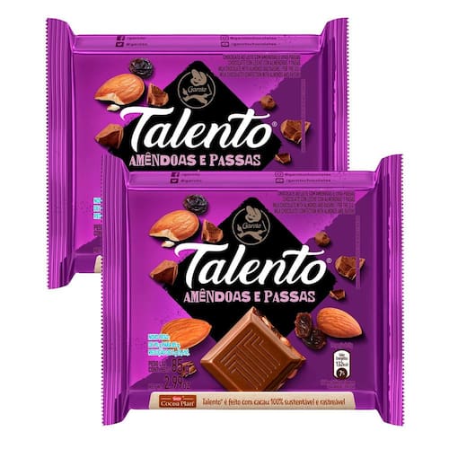 Chocolate Garoto Talento Amêndoas e Passas Delicioso, gostoso, saboroso. Essa combinação é simplesmente maravilhosa. Complicado mesmo é ter que comer um só. Ingredientes: Açúcar, leite em pó integral, manteiga de cacau, massa de cacau, amêndoa, uva passa, gordura vegetal, lactose, cacau em pó, gordura de manteiga desidratada, emulsificantes lecitina de soja (322) e poliricinoleato de poliglicerol (476) e aromatizante. Alérgicos: Contém Leite, Amêndoa E Derivados De Leite E De Soja. Pode Conter Amendoim, Castanha-De-Cajú, Castanha-Do-Pará, Avelã, Nozes, Aveia, Cevada E Trigo. Contém Glúten. Ean: 7891008121827