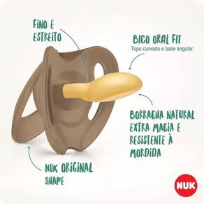 A chupeta é composta por um escudo, botão e argola de polipropileno, e o bico é feito de látex, sem a presença de BPA. A Chupeta NUK foi desenvolvida há mais de 60 anos por especialistas em odontologia e pediatria para imitar a forma natural do mamilo da mãe durante a amamentação, facilitando assim a transição entre o seio e a chupeta.