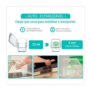 As Chupetas Mam Original Coleção Fundo do Mar vem em um estojo que permite esteriliza-las no micro-ondas em 3 minutos. Também pode ser usado para armazenamento e transporte.