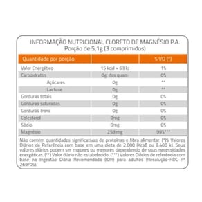 Ingredientes: Cloreto de Magnésio, Água Purificada, Amido de Milho; Antiumectantes: Carbonato de Cálcio (INS 170i), Dióxido de Silício (INS 551) e Estearato de Magnésio (INS 470iii), Estabilizantes: Hidroxipropilmetilcelulose (INS 464) e Polivinilpirrolidona (INS 1201), Agente carreador Polietileno glicol (INS 1521) e Corante: Dióxido de Titânio (INvS 171)