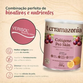 Kit 2 - Destaques - Peptídeos de Colágeno Verisol - Bioativos Amazônicos que auxiliam a sintetizar o colágeno - Fonte de Vitamina C - Fonte de Zinco e Ferro - Sabor natural de Camu-camu cítrico, semelhante ao sabor da Acerola - 30 doses em 210g Descrição O Colágeno Pro Skin é a combinação perfeita de bioativos e nutrientes servindo como um alimento funcional para uma pele mais firme e viçosa, unhas e cabelos mais fortes, melhora da saúde e da qualidade de vida. É fonte de vitamina C, zinco e ferro. O Verisol, que são os Peptídeos de Colágeno, é obtido a partir de uma tecnologia exclusiva alemã, comprovada como o melhor colágeno para pele do mundo. Atua nas células da pele, restaurando a jovialidade de dentro para fora e prevenindo o envelhecimento cutâneo. O Camu-Camu acumula nutrientes essenciais e sintetiza mais vitamina C do que qualquer outra fonte natural, o qual é um ativo essencial para a ação do colágeno no organismo. O Cubiu conta com altíssimas propriedades nutricionais e atua como precursor de hormônios essenciais para manutenção de uma pele saudável. Vitalidade para seu cabelo, pele e unhas: O colágeno é um componente essencial para manter a saúde do cabelo, as unhas e as articulações, além da elasticidade da pele que se perde ao longo do tempo. A principal função deste suplemento é fornecer resistência ao alongamento dos tecidos e colaborar com o correto funcionamento da cartilagem e dos ossos. Por ser um produto natural e sem aditivos químicos, pode haver uma pequena variação de cor, textura e sabor entre um lote e outro. São frutos integrais na composição do produto, portanto há a presença de fibras residuais. Sugestão de consumo Adicione 7g 1 medidor em 200ml de água, suco ou outra bebida de sua preferência. O colágeno pode ser consumido a qualquer momento do dia. Para um melhor resultado sugerimos o uso do produto de forma regular e contínua. Ingredientes Colágeno Verisol, Camu-camu, Cubiu, glicosídeo de esteviol, bisglicinato de zinco, aroma natural de morango, ácido ascórbico, beterraba em pó. Não contém Glúten, Não contém Lactose.