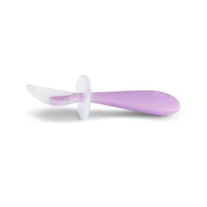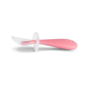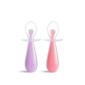 Kit com 2 colheres de silicone infantil rosa da Munchkin, com escudo de proteção. As colheres são flexíveis e macias, ideais para a alimentação do seu bebê.