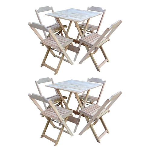 Kit 2 Conjuntos De Mesa Com 4 Cadeiras De Madeira Dobravel 70x70 Sem Pintura/Crua é ideal para bares, restaurantes, estabelecimentos, áreas de lazer e tambem para sua casa. Feito em madeira maciça, tornando resistentes e duráveis. Seu design permite que seja encaixado em qualquer ambiente, trazendo um toque a mais para seu estabelecimento. Além de sua durabilidade, o que lhe trará conforto para servir seus clientes. Por ser dobrável torna-se mais fácil guardar, manusear e limpar o produto. Atenção: EVITE USAR PRODUTOS ABRASIVOS E QUíMICOS PARA LIMPEZA DO PRODUTO, aconselha-se o uso de pano umedecido para melhor conservação; mantenha o produto fora de chuva e sol constantes MESA Cor: Sem Pintura/Crua Modelo: Dobravel Dimensões: Altura 76cm | Largura 70cm | Profundidade 70cm CADEIRA Cor: Sem Pintura/Crua Modelo: Dobravel Dimensões: Altura 80cm | Largura 45cm | Profundidade 42cm