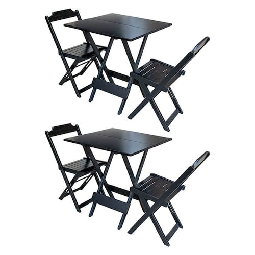 Kit 2 Conjuntos De Mesa Dobravel Com 2 Cadeiras De Madeira 70x70 Ideal Para Bar E Restaurante - Preto é ideal para bares, restaurantes, estabelecimentos, áreas de lazer e também para sua casa. Seu design permite que seja encaixado em qualquer ambiente, trazendo um toque a mais para seu estabelecimento. Além de sua durabilidade, o que lhe trará conforto para servir seus clientes. Por ser dobrável torna-se mais fácil guardar, manusear e limpar o produto. Atenção: EVITE USAR PRODUTOS ABRASIVOS E QUíMICOS PARA LIMPEZA DO PRODUTO, aconselha-se o uso de pano umedecido para melhor conservação; mantenha o produto fora de chuva e sol constantes. Dimensões: Medidas da Mesa: Altura: 76cm Largura: 70cm Comprimento: 70cm