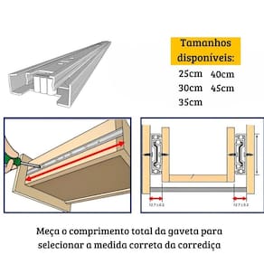 - Telescópica: Permite um deslizamento extensível, ideal para gavetas e portas que exigem maior profundidade. Diversos tamanhos: Disponível em várias medidas, atende a diferentes necessidades e projetos, desde móveis pequenos até armários amplos.