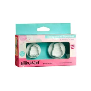 O kit de cortadores para massa desenho Festa da Silikomart é um conjunto de dois cortadores sem componentes metálicos.