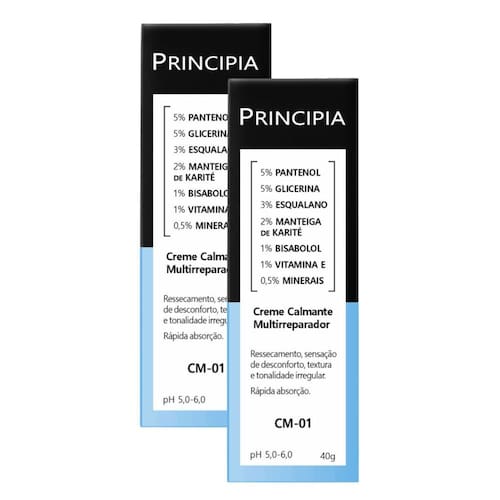 Creme Multirreparador CM 01 Principia 40g Creme com 17,5% de mix de ativos com propriedades hidratantes, calmantes e reparadoras para melhora do ressecamento, irritação, vermelhidão, ardência e descamação da pele. Principais · Aliviar a ardência · Amenizar a irritação · Diminuir a vermelhidão · Melhorar assaduras · Promover hidratação · Reduzir a descamação Complementares · Aumentar a firmeza e elasticidade · Melhorar o viço · Proporcionar maciez Tipos de pele · TODOS MODO DE USO · Aplique duas vezes ao dia na pele limpa e seca · Espalhe delicadamente até completa absorção ATENÇÃO · Evite exposição solar sem proteção · Evite contato com os olhos · Mantenha fora do alcance de crianças · Havendo irritação, suspenda o uso e procure por orientação médica Ingredientes Ativos Vitamina E; Glicerina; Manteiga de Karité; Pantenol; Esqualano; Bisabolol; Minerais. Marca: Não Informado