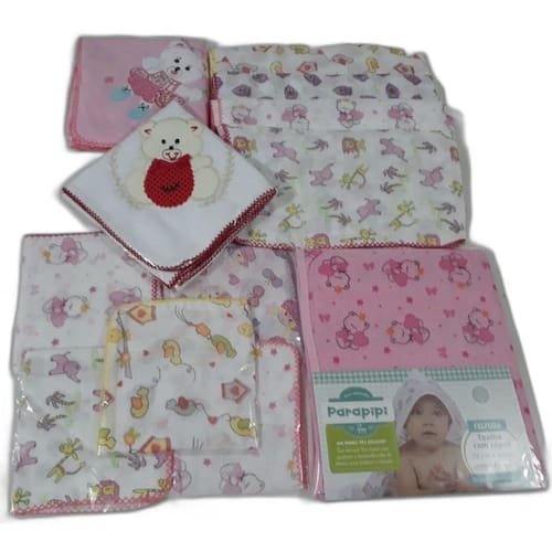 Este kit contém 5 Fralda luxo estampada 70x70cm com crochê feito a máquina 10 Fraldinha de boca estampada 33x33cm com croche feito a maquina 1 Toalha felpuda 70x90cm com capuz 2 Cueiro flanelado 80x80cm bordado com crochê feito a máquina Detalhe dos produtos: Tecido fraldas: macia dupla 100% algodão Tecido toalha: 100% algodão Tecido cueiro: flanelado 100% algodão Cores: para menina Marca DUGU Marca: Não Informado