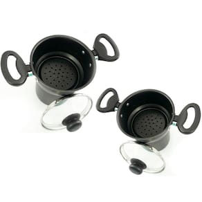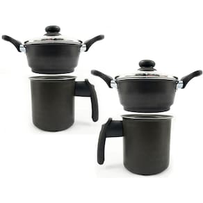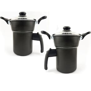 Kit 2 Cuscuzeiros Individuais Para Uma 1 Pessoa com Tampa de Vidro Cor: Preta/Preta características: A Cuscuzeira da Dona Chefa possui toda sua estrutura feita em alumínio e tampas de vidro sendo somente o pegador e a alça em baquelite que é um material antitérmico e de alta resistência, que facilitam o manuseio da panela. Essa cuscuzeira pode ser levada à lava louças e a todos os tipos de fogões. Ela deixa o ambiente com um toque moderno e sofisticado sendo com certeza o instrumento que falta para completar sua cozinha. Serve apenas uma 1 pessoa. Especificações: - Tampa de Vidro- Anti Aderente- Serve uma 01 Pessoa- Contem uma 01 receita de cuscuz docê|salgado- Pegadores feitos de Baquelite Peso e Medida: - Peso: 0,490- Altura cuscuzeira: 6 cm- Altura Fervedor: 10 cm- Diâmetro: 10 cm Itens Inclusos: - 02 Cuscuzeira- 02 Fervedor- 02 Receita de cuscuz