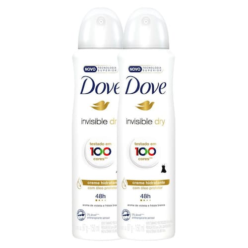 Desodorante Antitranspirante Aerosol Dove Invisible Dry • O Desodorante Antitranspirante Aerosol Dove Invisible Dry não deixa manchas brancas nas roupas, testado em 100 cores** de tecidos • Com tecnologia superior, o antitranspirante Dove garante proteção contra o suor e mau odor por até 72h, dando uma sensação de limpeza e frescor • Dove Invisible Dry é um desodorante antitranspirante sem álcool*** em sua fórmula, que cuida das suas axilas e das suas roupas • Este desodorante aerosol de rápida absorção e delicado para suas axilas é o número 1 em cuidado* para a sua pele • Contém 1/4 de creme hidratante e vitamina E, além de uma agradável fragrância de violeta e frésia branca • Dove não realiza testes em animais, sendo certificada como Cruelty-Free pela PETA. Este aerosol é vegano, não danifica a camada de ozônio e nossas latas são feitas de metal reciclável O Desodorante Antitranspirante Aerosol Dove Invisible Dry foi desenvolvido para não deixar manchas brancas em até 100 cores** de tecido. Feito com tecnologia superior que cuida e protege as axilas por 72 horas contra suor e mau odor, mantendo as axilas secas o dia todo. Este desodorante foi eleito o número 1 em cuidado* da pele das axilas pelas nossas consumidoras. Formulado com 1/4 de creme hidratante e vitamina E, ajuda a manter a hidratação da pele das axilas, e as deixa suaves e macias. O desodorante Dove sem álcool*** é gentil com sua pele e, além de proteger contra suor e mau odor, possui uma deliciosa fragrância floral de violeta e frésia branca, dando uma sensação de limpeza e frescor. Dove proporciona proteção eficaz e cuidado para a pele das axilas, para que você possa se libertar de qualquer desconforto e se sentir confiante o dia todo. Para uma melhor proteção contra marcas de suor e irritação da pele, siga estas dicas: após o banho, garanta que as axilas estão bem secas; para obter o máximo do seu Desodorante Antitranspirante Aerosol Dove Invisible Dry, agite a embalagem para ativar os ingredientes; segure-a voltada para cima a 15 cm das suas axilas e aplique um jato de dois segundos em cada uma. Dove é certificada Cruelty-Free pela PETA, sendo assim, não realizamos e nem realizaremos testes em animais em nenhum lugar do mundo. Além disso, nosso antitranspirante é vegano, fabricado com energia elétrica 100% renovável, nossa lata é feita de metal reciclável e o produto não danifica a camada de ozônio. *Antitranspirante Aerosol mais vendido do mercado de desodorantes no Brasil (Nielsen Retail Index INA+INFC, Novembro 2021 a Outubro 2022). **Comprovado contra manchas brancas em 100 cores. ***Não contém álcool etílico.