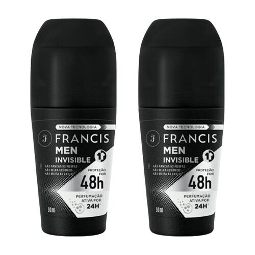Desodorante Francis Roll On Men Invisible 50ml Modo de usar: Aplicar naas axilas. Benefícios: 48h de proteção, 24h de perfumação ativa, 0%álcool, vegano, não mancha as roupas, dermatologicamente testado.