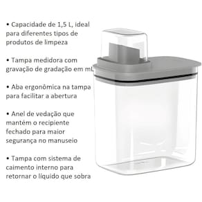 O Dispenser Flow 1,5L é a solução ideal para armazenar uma variedade de produtos de limpeza, como amaciante, sabão em pó e desinfetante. Sua transparência facilita a gestão visual da lavanderia, proporcionando tranquilidade durante as tarefas domésticas.