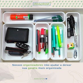 Kit 2 divisor de talheres para gaveta resistente organizador multiuso ========== sobre o produto ========== O divisor de talheres para gaveta resistente organizador multiuso é ideal para manter sua cozinha ou escritório sempre organizados. Com compartimentos bem definidos, ele acomoda talheres, utensílios de cozinha, materiais de papelaria ou acessórios diversos. Produzido em material resistente, é fácil de limpar e se adapta à maioria das gavetas, otimizando o espaço com praticidade e funcionalidade. ========== especificações ========== Organizador versátil, ideal para talheres, utensílios, papelaria e outros itens. Design compacto e funcional, otimiza o espaço da gaveta. Material durável e fácil de higienizar. Compartimentos separados, facilitam a organização por categoria. Visual moderno, combina com diversos estilos de ambiente. ========== ficha técnica ========== Unidades: 2 Cor: branco Medidas: 31cm x 30cm x 4,5cm Material: polipropileno Marca: dasplast : 3 meses Estamos online para quaisquer dúvidas, Agradecemos e aguardamos o seu pedido. P: serve para gavetas de escritório também R: sim, é ideal para organizar itens como clipes, canetas, blocos e outros materiais. P: o produto é ajustável R: sim, o produto é modular. Com 4 compartimentos separados. P: pode ser lavado com água e sabão R: sim, o material é resistente e fácil de limpar. P: o produto é novo ou