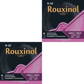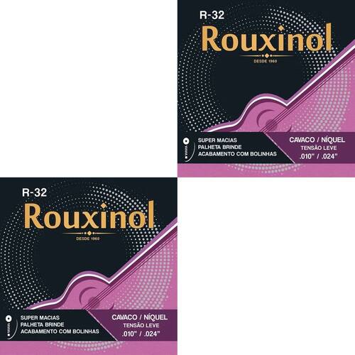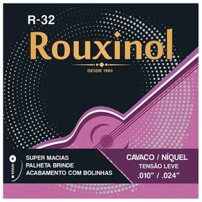 Kit 2 Encordoamento Cavaquinho Tensão Leve “0.24 R32 Rouxinol + BrindeAs cordas Rouxinol proporcionam um ótimo timbre para o seu cavaquinho com um excelente custo-benefício, trazem a mesma qualidade presente em todos os tradicionais produtos Rouxinol / Nig. O modelo R32, em especial, tem a “exclusiva ação macia”.São ótimas para vários estilos musicais brasileiros dando um bom e equilibrado timbre o seu cavaquinho.Tensão das Cordas: .010 - .012 - .018 - .024 (leve)Características:Acabamento com bolinhasPrimas: Aço inoxidável (não enferrujam).Super MaciasBordões: Alma de aço carbono estanhado, encapada com níquel.Itens Inclusos:2 Encordoamentos Cavaquinho Tensão Leve “0.24 R32 Rouxinol 2 Palhetas*Imagens Ilustrativas*
