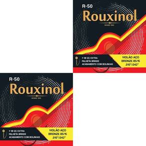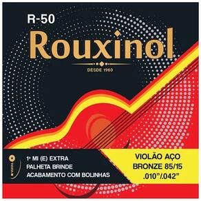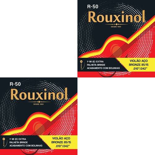 Kit 2 Encordoamento Violão Aço R50 Rouxinol .010” + BrindeArames hexagonais (sextavados) importados dos EUA e produzidos em máquinas modernas, automáticas/computadorizadas, agregando ainda mais qualidade. R-50 conta com a leveza no toque, bem como a clareza de timbre e brilho.Características:Marca: RouxinolMateriais: AçoTensão: MédiaBordões: Alma de aço carbono estanhado, encapada com metal prateadoPrimas: Aço inoxidável (não enferrujam).Bordões: Alma de aço hexagonal, encapada com Bronze 85/15. Itens Inclusos:2 Encordoamento Violão Aço R50 Rouxinol .010” + Brinde2 1ª Corda Mi(E) Extra2 Palhetas