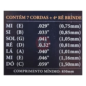 7 Cordas Cristal Pesada: Este encordoamento é projetado para violões de 7 cordas, proporcionando uma extensão tonal mais ampla e abrangente. As cordas de tensão pesada oferecem uma resposta sólida e uma projeção sonora notável.