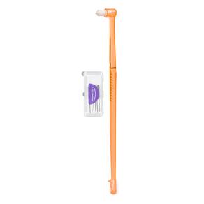 Comece a higienização com o lado interdental, inserindo delicadamente a escova no último dente inferior esquerdo. Prossiga pelo lado interno até o último dente do lado posterior ao qual iniciou. Utilize o lado de tufo único para higienizar tanto o lado interno quanto o externo dos dentes.