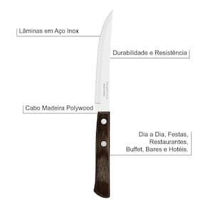 Kit 2 Facas de Churrasco Tramontina Polywood Inox Cabo Castanho Você que precisa de talheres de qualidade na hora seus convidados e principalmente para o dia a dia Agora você tem a Faca de Churrasco Tramontina Polywood Inox Cabo Castanho de 5 polegadas, seu churrasco no jantar ou almoço terá o charme e a qualidade que você merece. Com lâmina produzida em aço inox com tratamento térmico, a faca possui fio de alta durabilidade e resistência. Possui cabo em madeira tratada Polywood que proporciona a combinação perfeita de material e cor, ideal para ambientes residenciais e comerciais. Além de tudo isso, pode ir à máquina de lavar louças facilitando seu dia a dia ainda mais. Este modelo é ideal para festas, restaurantes, buffet, bar e hotéis. Legal né Compartilhe com seus Amigos