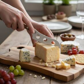 Faca para Queijos Moles (Com Furos Antiaderentes) - Design vazado que reduz o atrito, evitando que o queijo grude - Perfeita para brie, camembert e queijos frescos - Corte limpo e preciso sem deformar as fatias