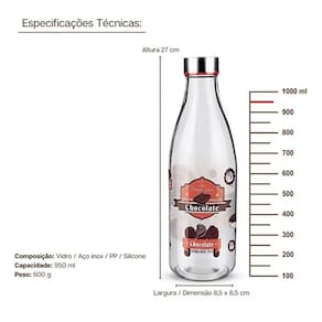 Kit 2 garrafa de vidro 950ml tampa aço inox leite água suco euro ========== sobre o produto ========== A garrafa de vidro 950ml com tampa de aço inox euro é ideal para levar charme e praticidade à sua rotina. Perfeita para armazenar e servir leite, sucos, água ou outras bebidas, ela conta com uma ilustração divertida de chocolate que dá um toque especial e acolhedor à peça. Fabricada em vidro resistente e com tampa de aço inox, mantém o conteúdo protegido e fresco por mais tempo. Uma escolha funcional e cheia de estilo para sua cozinha. ========== especificações ========== Capacidade de 950ml, ideal para uso diário com diferentes bebidas. Tampa em aço inox, que ajuda na conservação e evita odores. Ilustração temática de chocolate, charmosa e divertida. Feita em vidro de alta qualidade, resistente e fácil de limpar. Ideal para servir à mesa com elegância ou armazenar na geladeira. ========== ficha técnica ========== Unidades: 2 Medidas: 27 x 8,5 x 8,5cm Material: vidro / tampa de aço inox Capacidade: 950ml Marca: euro home : 3 meses Estamos online para quaisquer dúvidas, Agradecemos e aguardamos o seu pedido. P: a tampa veda bem R: sim, a tampa de inox possui boa vedação, ideal para conservar o conteúdo. P: o produto é novo ou Marca: Não Informado Ean: 7900425528055